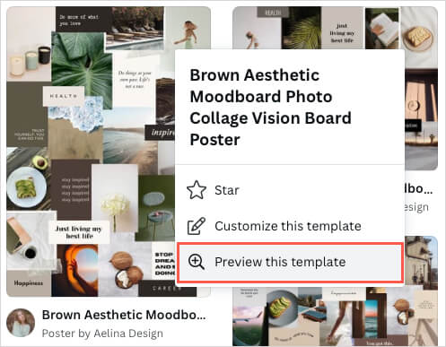 - 興味のあるテンプレートを見ると、そのプレビューを見ることができます。テンプレートの画像の右上にある3つのドットを選択し、選択しますこのテンプレートをプレビューします。