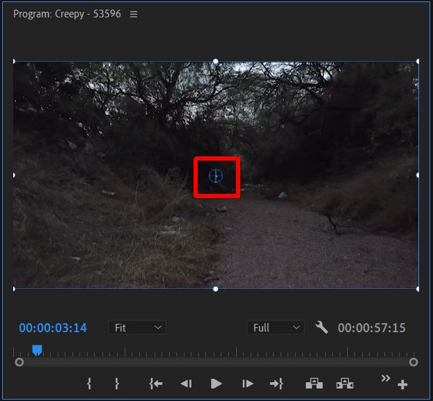 - クリップの特定の領域にズームインするには、プログラムパネルと呼ばれる円形の青色のターゲットを見つけますアンカーポイント、おそらくパネルで選択したときにクリップの中央にあります。