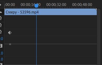 - エフェクトコントロールの横に表示されるキーフレームタイムラインでは、ズームインを終了させたいクリップのポイントまで、プレイヘッド(タイムラインの青いマーカー)をスライドさせます。