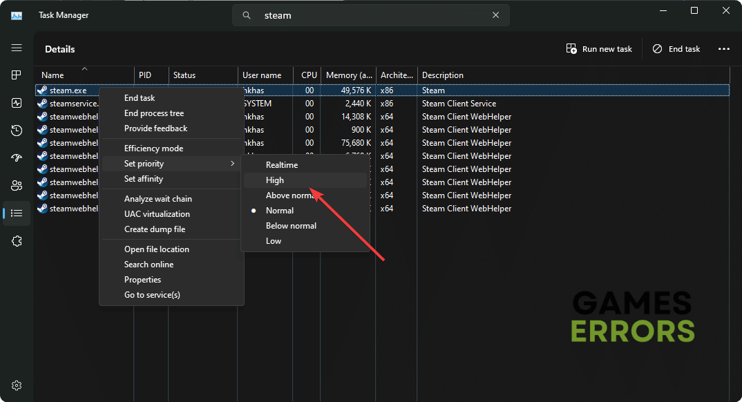 3. 希望するプロセスを右クリックして、移動します優先順位を設定します、および選択します高い