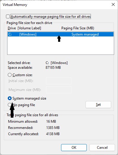 2。ページングファイルを使用してドライブを選択し、クリックしますシステムマネージドサイズ。