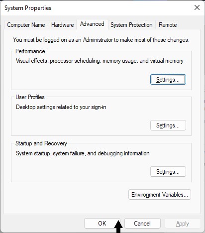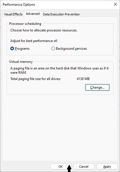 5。さて、開いてください高度なタブ。その後、選択します変化下仮想メモリ。