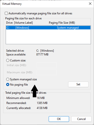 2。削除するページングファイルを使用してドライブを選択し、その後に選択しますページングファイルはありません。