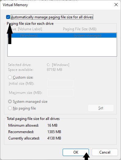 6.選択すべてのデバイスのページングファイルサイズを自動的に管理します、クリックしますわかりました。