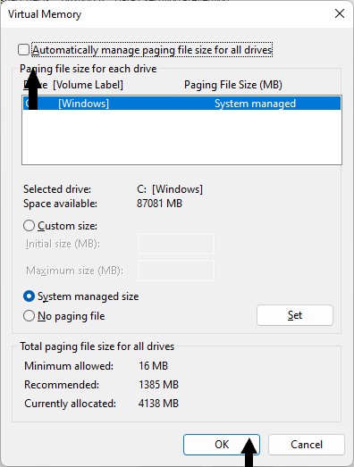 方法3:特定のドライブがシステム管理されるようにページングファイルサイズを設定する