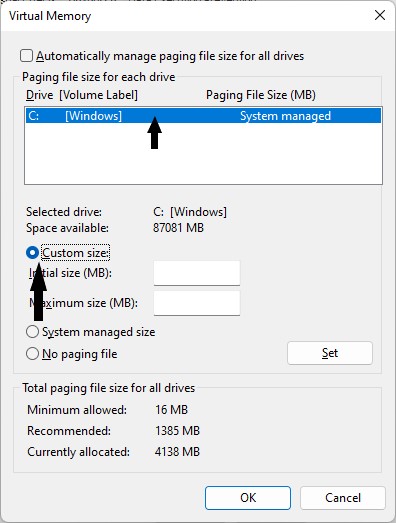 3.ページングファイルを使用してドライブを選択し、クリックしますカスタムサイズ。 (以下のスクリーンショットを参照)