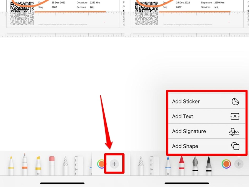 10。さらに、タップすることができます+カラーピッカーの横にあるボタンは、PDFファイルに追加のアイテムとオブジェクトを追加します。ステッカー、テキスト、デジタル署名、 そして形。