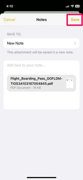 次のプロンプトで、画面の右上隅にある[保存]ボタンをタップして、iPhoneで注釈を付けたい選択したPDFドキュメントを使用して新しいメモファイルを作成します。