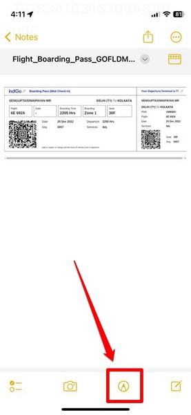 iPhoneのPDFファイルまたはノートアプリに画像を使用してノートを開いたら、下部メニューバーにマークアップツール(ペングリフを備えたもの)をタップして、選択したファイルの注釈を開始します。