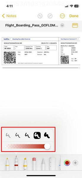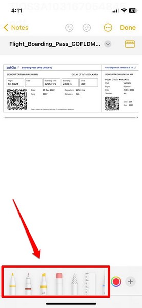 iPhoneのノートアプリの内蔵マークアップツールを使用して、指または互換性のあるデジタルスタイラスを使用してPDFファイルに書き込みます。