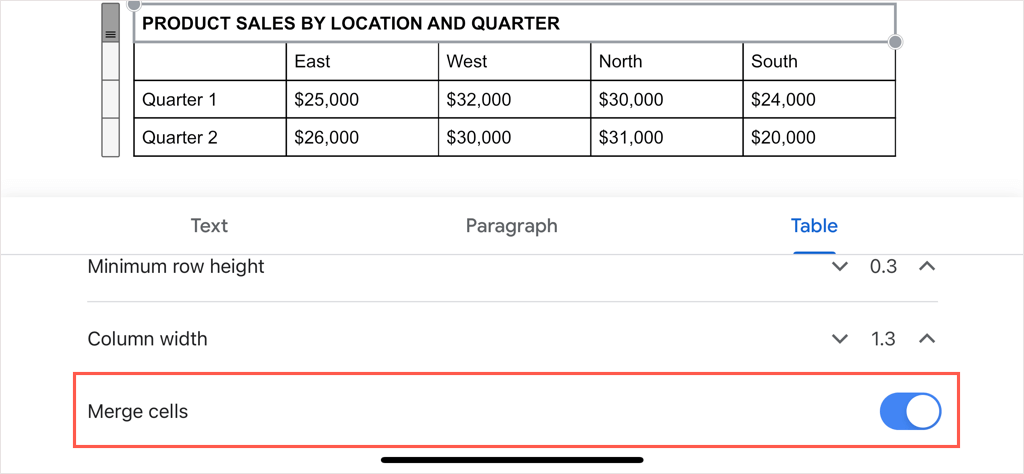 - タップします形式ボタン(下線付きa)上部で、を選択しますテーブルポップアップメニューのタブ、およびのトグルをオンにしますセルをマージします。