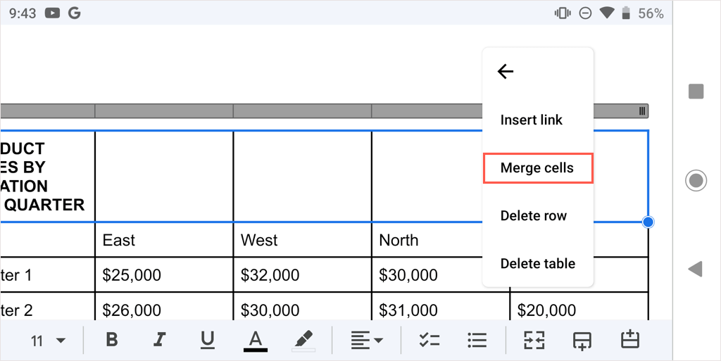 - タップしますセルをマージします画面の下部にあるツールバーのボタン。