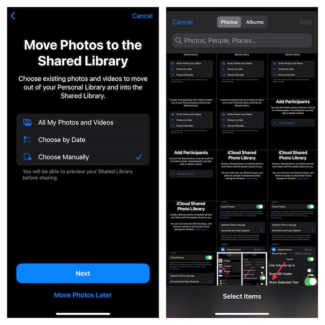 - 手動で写真を選択してください:共有ライブラリに追加する写真を手動で選択します。