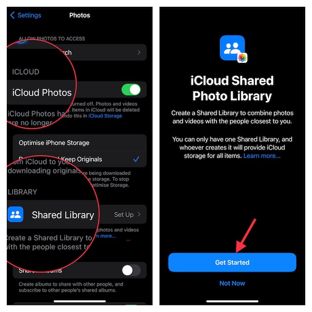 4。次の画面では、iCloud共有フォトライブラリの簡単な説明が表示されます。をタップします始めましょう続行するために下部のオプション。