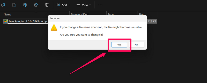 5。次のプロンプトで、Windows 11は、APKファイルの名前を変更(および変換)することで、プラットフォームで使用できなくなる可能性があることがわかります。クリックしますはいボタンアクションを確認します。