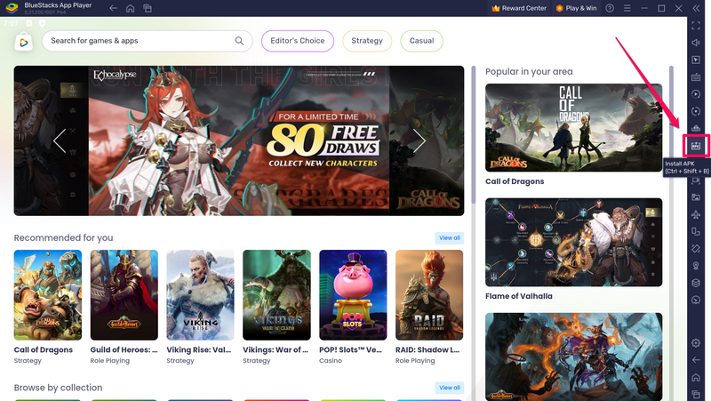 10。その後、クリックしますAPKボタンをインストールしますに正しいメニューバー。または、Ctrl + Shift + Bを押して、Bluestacks内で同じアクションを実行することもできます。