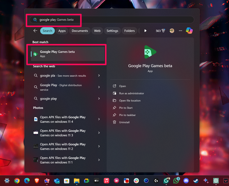 7。次に、Windows + Sを使用して開きますWindows検索、Google Playゲームアプリを見つけます、 そしてクリックして開きます。