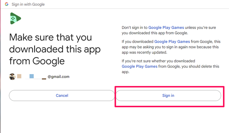 9。f画面上の指示をollowしますクリックしますサインインボタンGoogle WebサイトからGoogle Playゲームアプリをダウンロードしたことを確認します。これは、Google Playゲームアプリになりすましている可能性のあるフィッシングアプリにGoogleアカウントの資格情報を提供することを妨げるためです。