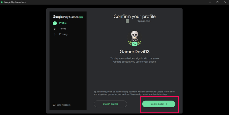 10。既存のGoogle Playゲームプロファイルを選択するか、別のGoogleゲームプロファイルに切り替えます。クリックします良いボタンに見えます終わったら。