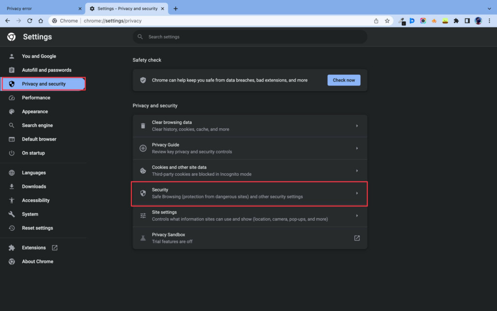 2。行きますプライバシーとセキュリティサイドバーからオプションを選択してから選択します安全提供されたオプションから。