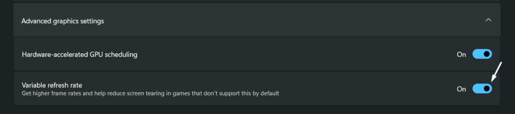 2。拡張します高度なグラフィック設定セクション有効にします可変リフレッシュレートトグル。