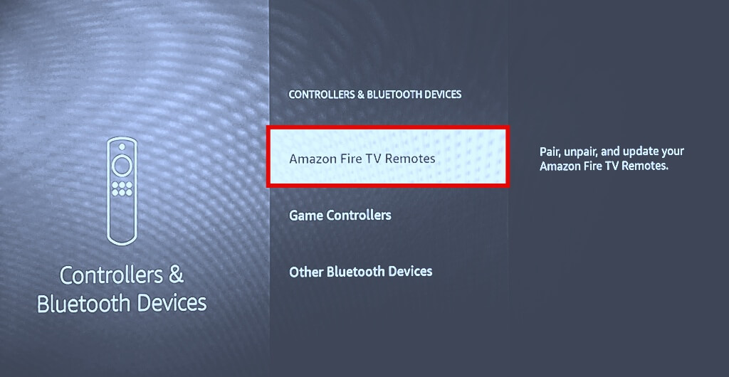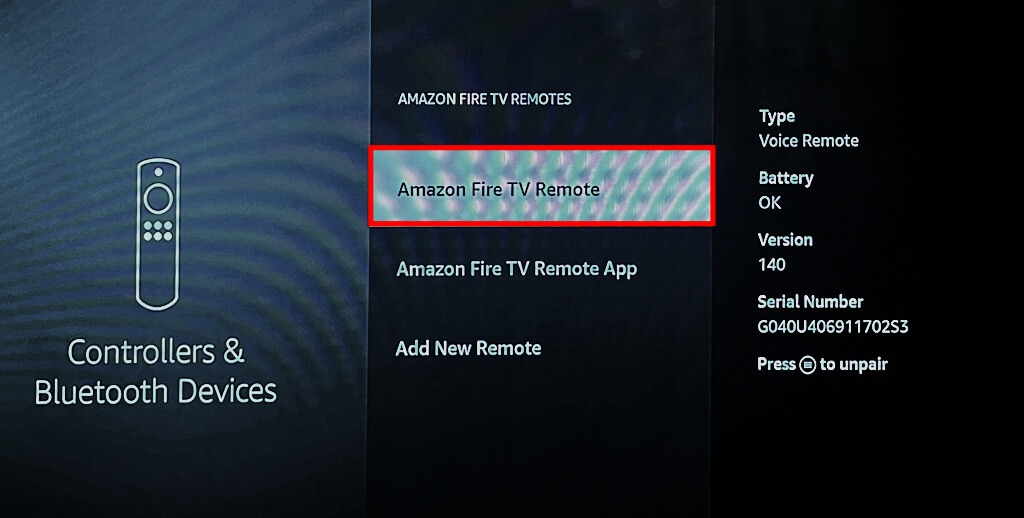 - 火のテレビ設定メニューを開き、に向かいますコントローラーとBluetoothデバイス>Amazon Fire TVリモート、そして、あなたが必要とするリモコンを選択します。