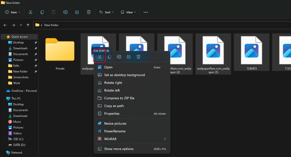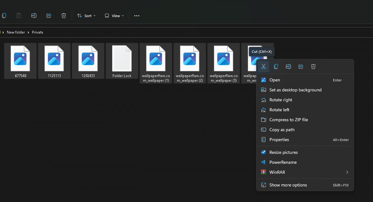 - これで、フォルダー内に非表示またはロックするファイルを追加できます。 [ファイル]> [右クリック]> [右クリック]> [サイザー]アイコンをクリックして、ファイルをカット/移動します。