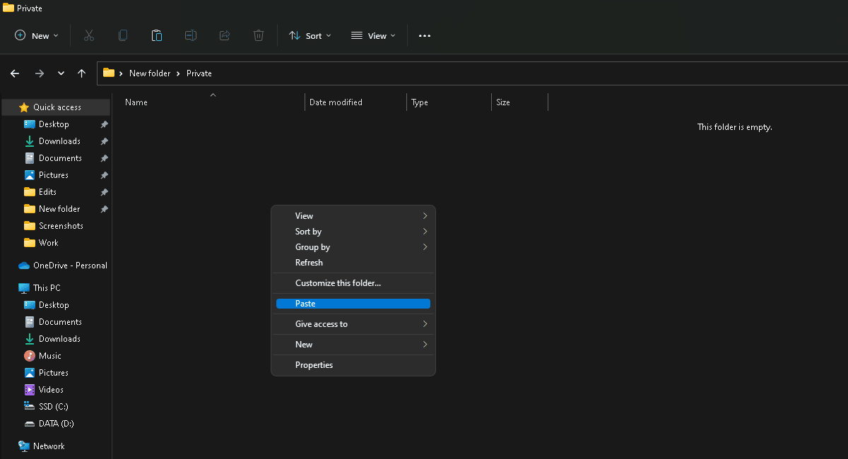 - プライベートフォルダーを開く>右クリック>ファイルを貼り付けます。