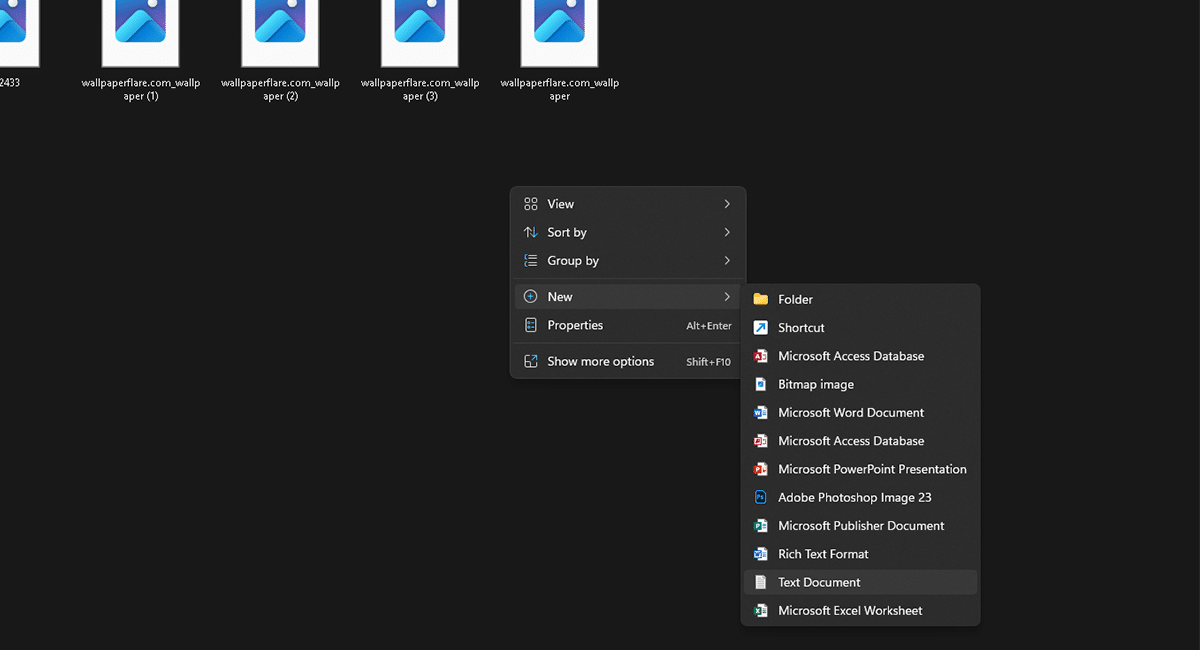 - ファイルの内部フォルダーの内部空きスペースを右クリック>新しい>テキストドキュメント。
