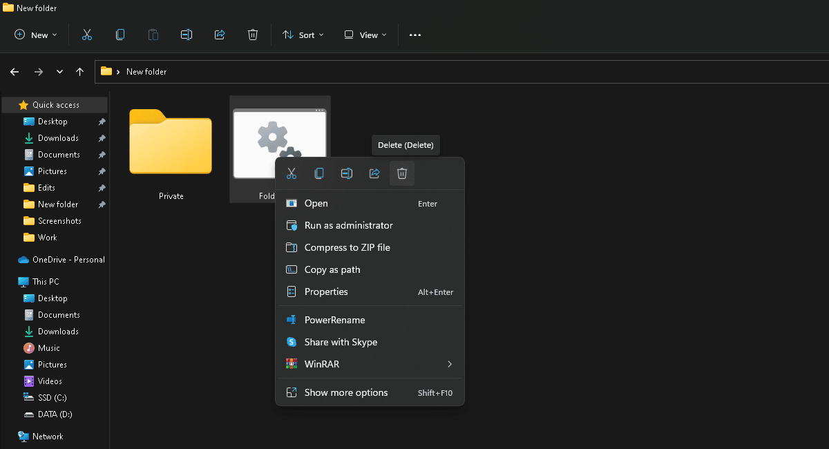 - [プライベート]フォルダー> [削除]を右クリックします。