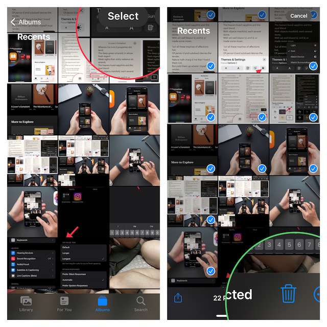 2。で図書館タブ、すべての写真をタップして、削除する写真またはビデオを選択します。複数の写真やビデオを同時に選択して削除プロセスを開始する場合は、タップでタップします選択しますすべての写真をタップした後。次に、削除する写真の上に指をタップまたはスライドさせます。