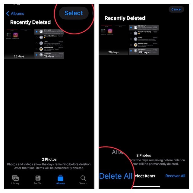 6。不要なファイルの選択が完了したら、タップしてください消去。最近削除されたアルバムを完全にクリアしたい場合は、選択してくださいすべてを削除します。