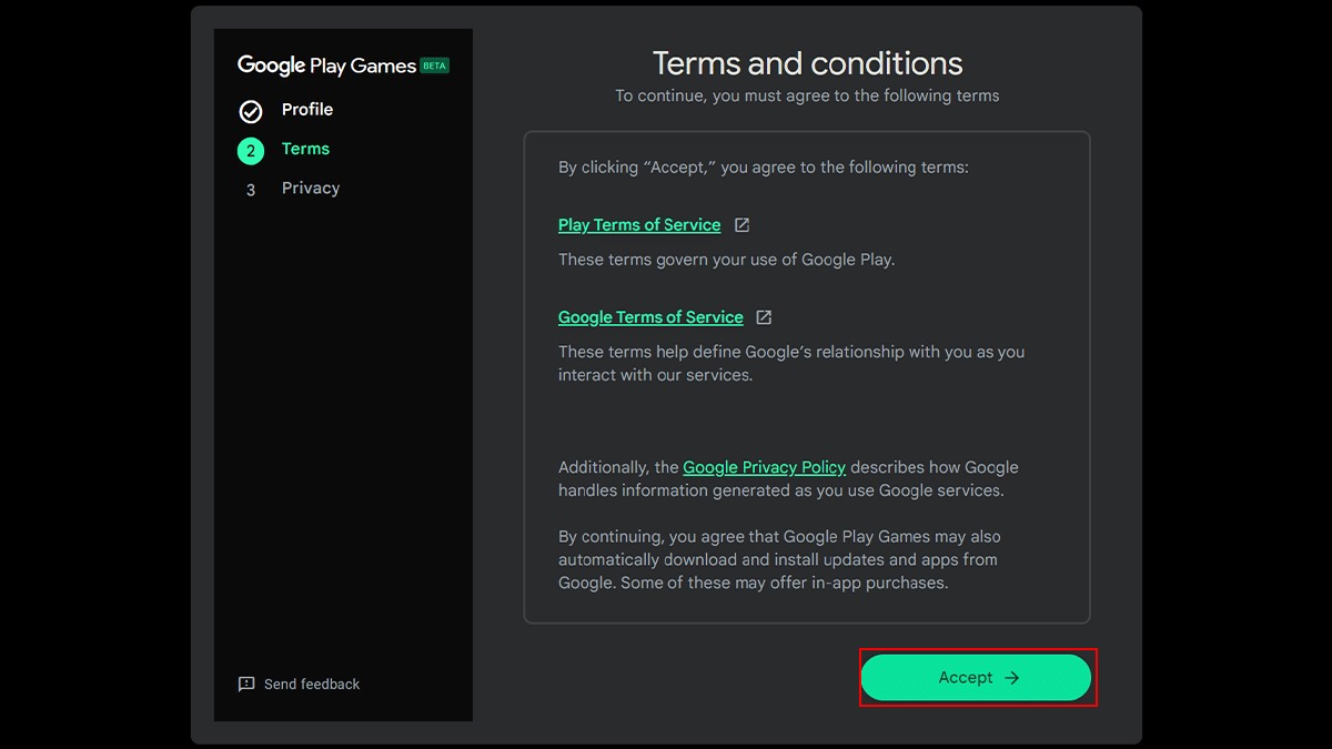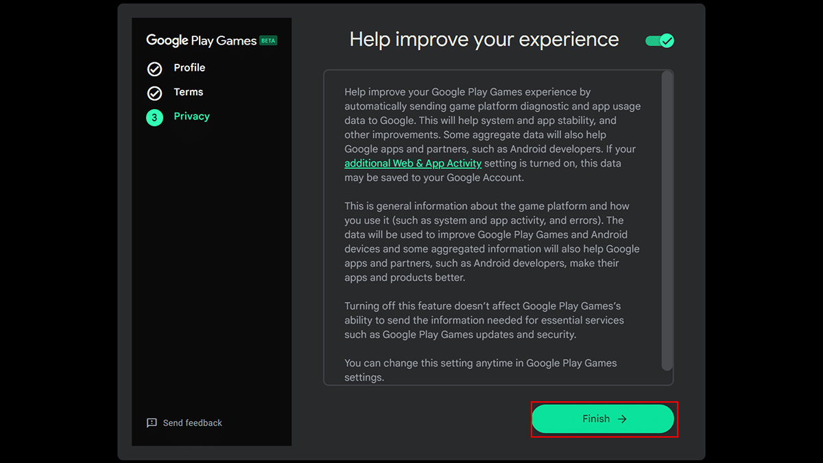 - クリックします仕上げるプライバシー条件を受け入れるボタン。