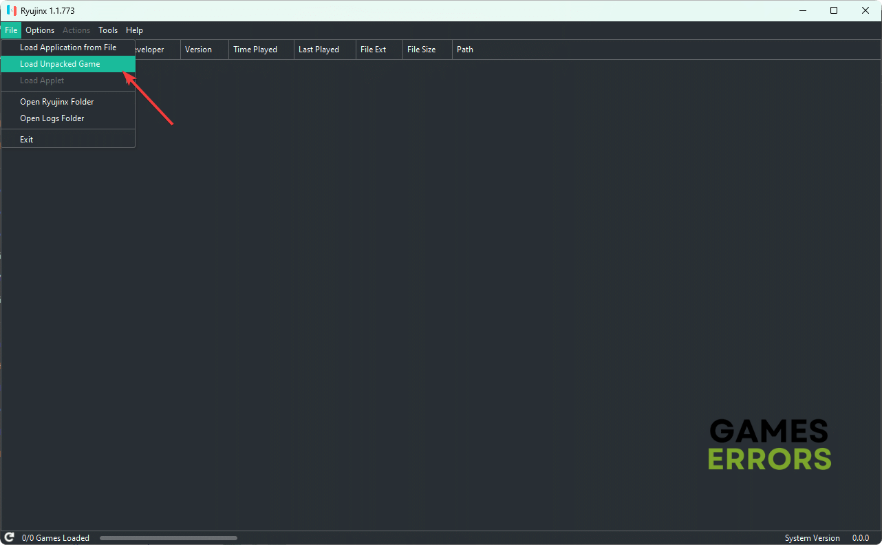 6. ryujinxで、ファイルをクリックしてから、ダウンロードされたゲームファイルに応じて、ファイルから[解放されたゲーム]またはロードアプリケーションをクリックします。