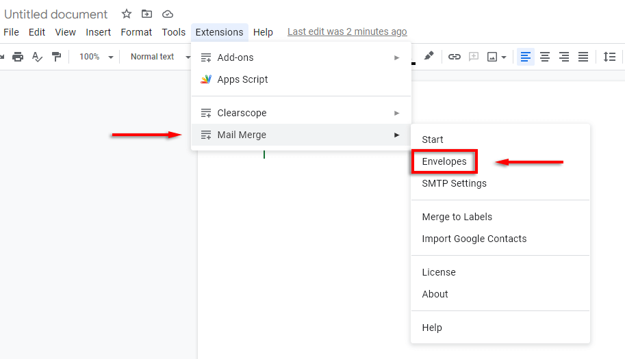 - インストールしたらクリックします拡張機能>メールマージ>封筒。または、選択しますメールマージサイドバーから選択します封筒。