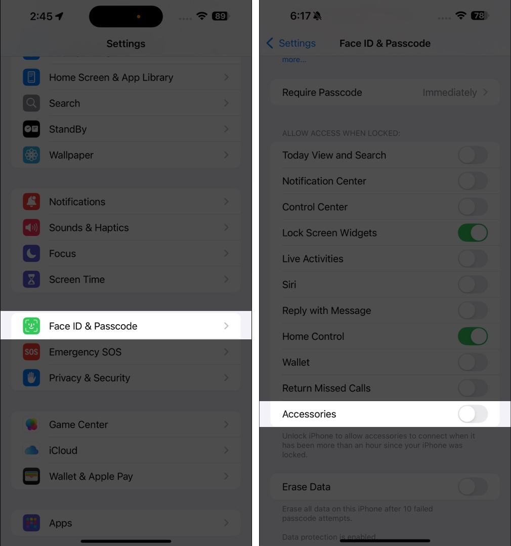 誰もあなたの設定を改ざんしたり、不正なアクセサリーを接続したりすることができないようにするには、開いてください設定iPhoneで選択しますFace ID&PassCode。ホームボタンを備えた古いiPhoneがある場合は、選択しますIDとPassCodeをタッチします。次に、プロンプトが表示されたらデバイスPassCodeを入力して、ロックされているときにアクセスを許可しますセクション。最後に、切り替えますコントロールセンターそしてアクセサリーロック画面からのアクセスを防ぐため。