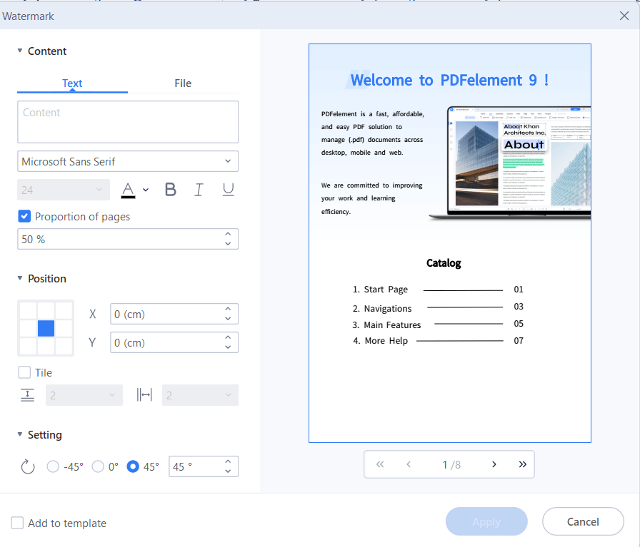 - 次の画面では、右側には、透かしを追加するためのいくつかのオプションが表示されます。テキストと画像を追加し、PDFでの位置を変更し、透明度レベルも変更できます。それだけでなく、透かしを表示したいページ範囲を選択できます。