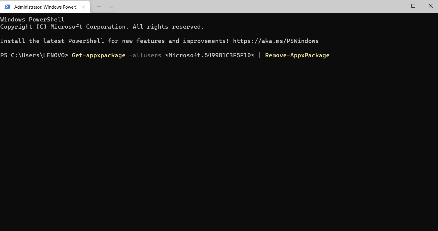 Get-AppxPackage *Microsoft.549981C3F5F10* | Remove-AppxPackage
