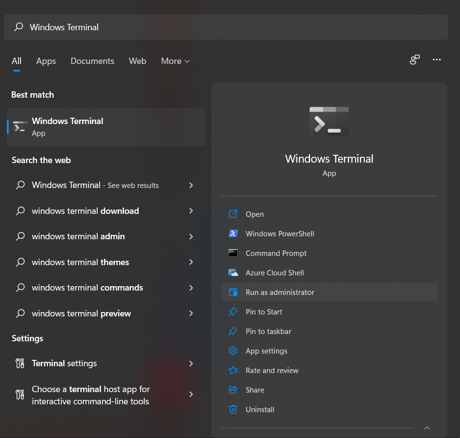 1。管理者としてWindowsターミナルを開きます。そうするために、入力しますWindowsターミナルWindowsで検索クリックしてください管理者として実行します。ユーザーアカウントコントロールによってプロンプトされた場合は、をクリックしますはい管理者としてターミナルを開くためのタブ。