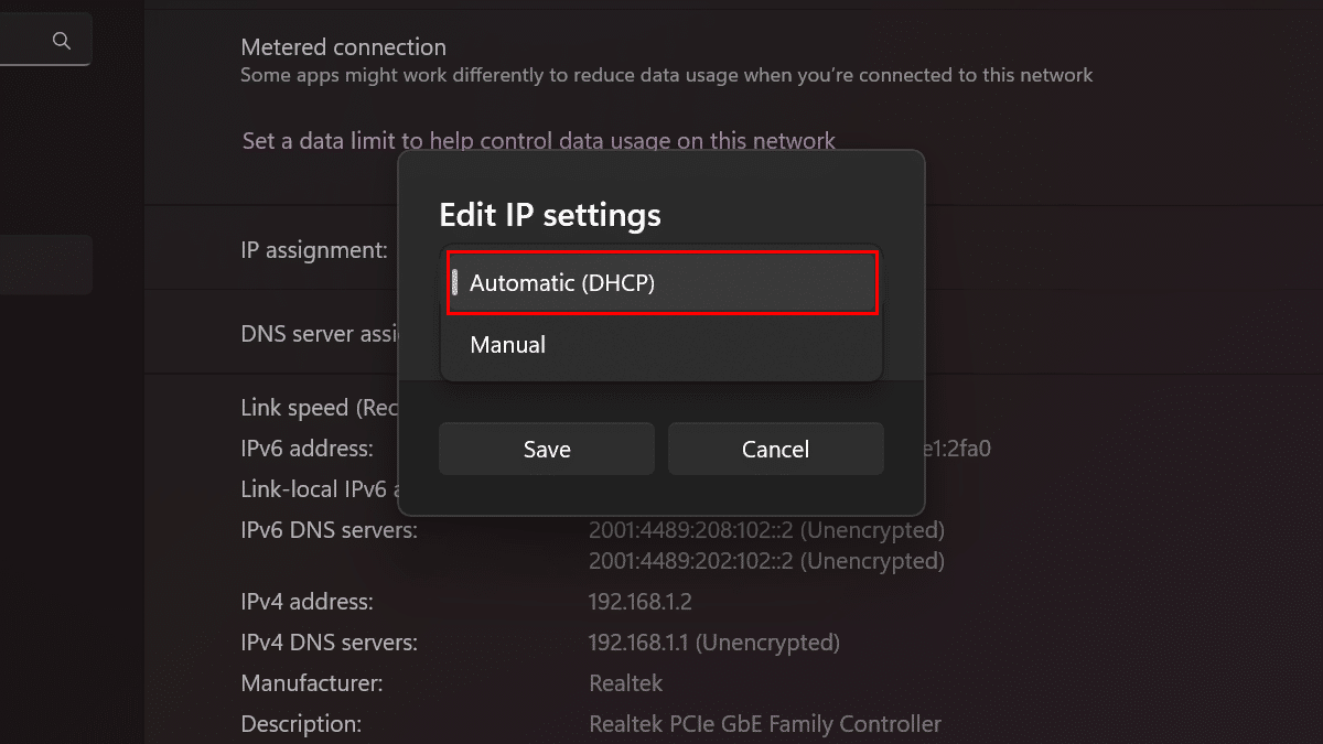 - 完了すると、TCP/IP構成が静的に割り当てられたWindows 11が削除され、コンピューターはDHCPサーバーから動的なIPアドレスを使用します。