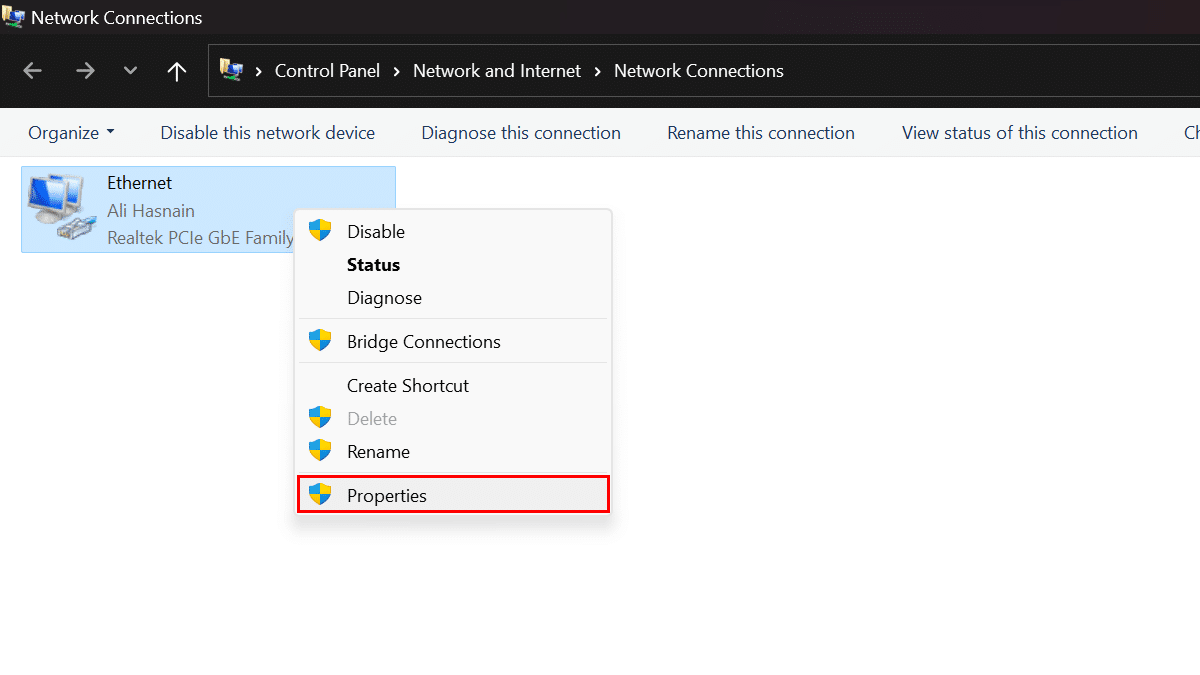 - 静的IPアドレスを削除する必要があるネットワークアダプターを右クリックして選択しますプロパティ。