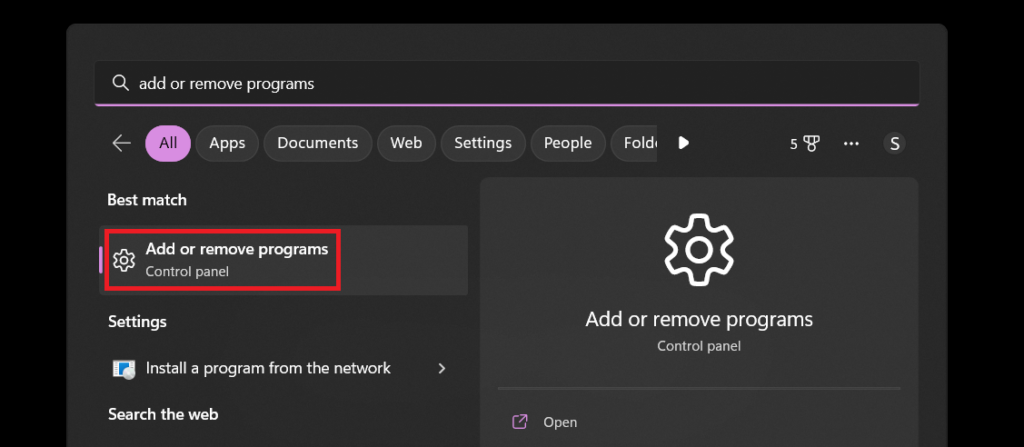 1。開きますWindows検索ボックス、 タイププログラムを追加または削除しますその中で、検索結果から選択します。