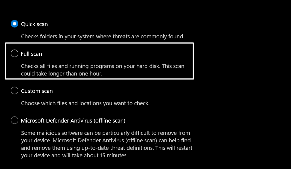 3。選ぶフルスキャン、そしてクリックします今すぐスキャンします徹底的なウイルススキャンを開始するボタン。