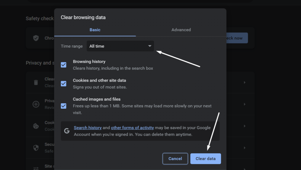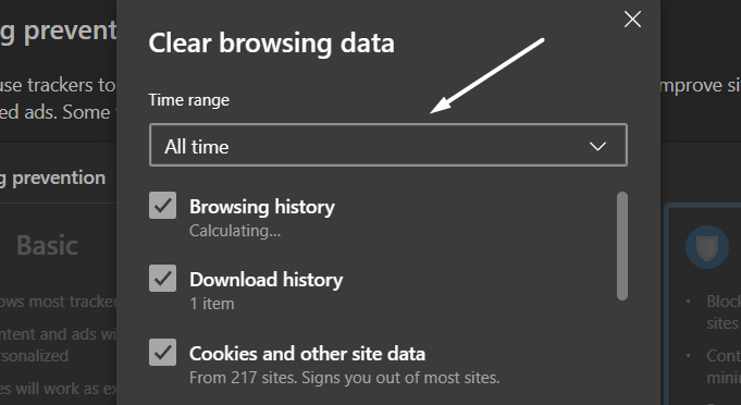 3。設定します時間範囲ドロップダウンいつもそして、のすべてのチェックボックスを確認します閲覧データをクリアしますプロンプト。