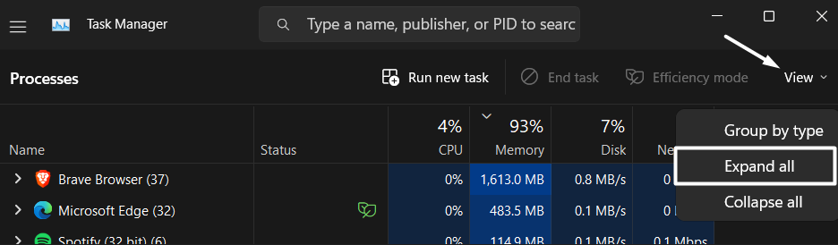 2。をクリックしますビュー次のオプション効率モード選択しますすべて拡張しますドロップダウンメニューから。