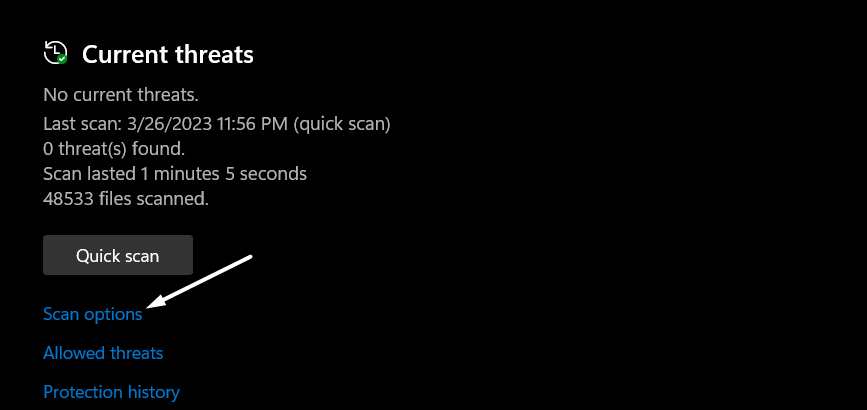 2。選択しますウイルスと脅威の保護からベストマッチセクションとクリックしますスキャンオプション下現在の脅威。