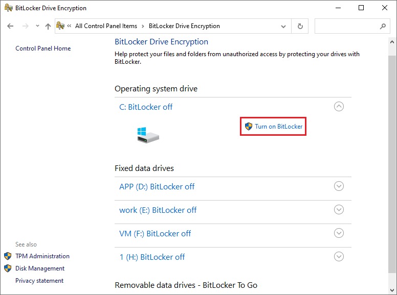 6。選ぶビットロッカードライブ暗号化クリックしますBitLockerをオンにします電源を入れるオプション。