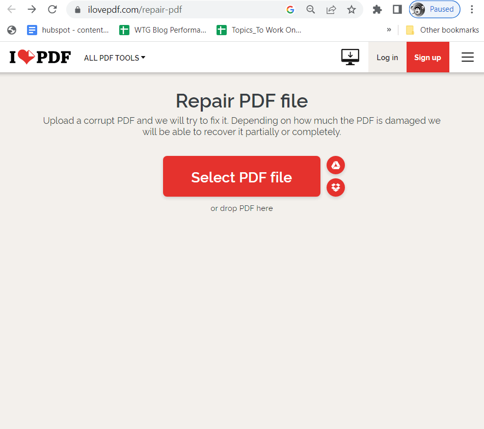 外出中に損傷したPDFファイルをオンラインで修理することもできます。たとえば、ILOVEPDFは、PDFファイルを修復するのに最適なプラットフォームの1つです。これがあなたがそれをする方法です -