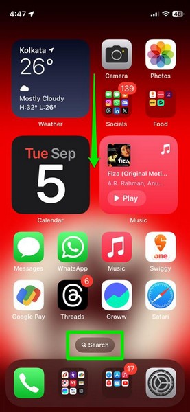 1。 画面の中央部の部分からスワイプしますまたは検索ボタンをタップします(有効にする場合)iPhoneのホーム画面にスポットライト検索を開きます。