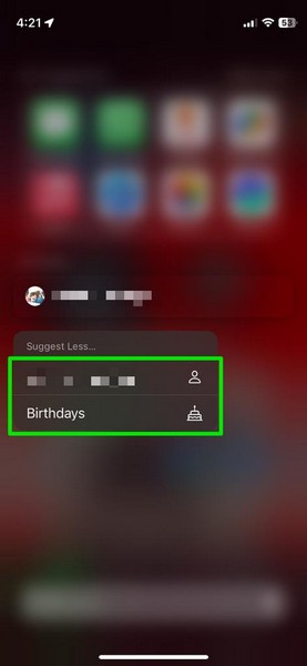 3。今、それについて言及する価値がありますコンテキストメニューが異なる場合がありますあなたが隠そうとしているSiriの提案の種類に基づいて互いに。私の場合、提案には連絡先と誕生日が含まれるため、コンテキストメニューは、私が見たいと思う提案のどの側面を尋ねます - 誕生日または接触。誕生日を選択すると、連絡先の選択肢を選択しながら、スポットライト検索でSIRIの提案として誕生日が少なくなります特定の連絡先を含むすべての提案を非表示にします。